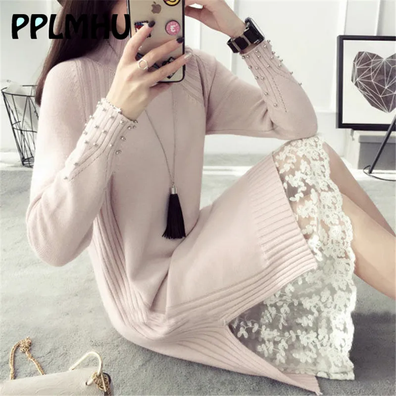Promo Winter Plus Size 2XL Lace Dress Women Maxi Knitting Long Turtleneck Basic Dress Autumn Warm Long Sl